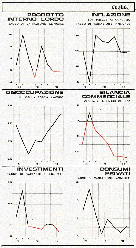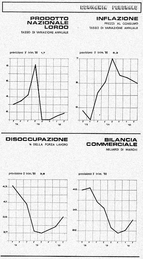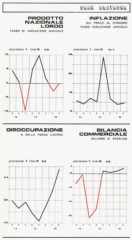Prezzi. Il tasso d'inflazione, per la previsione dell'intero 1980, è previsto nella misura del 19%, ciò che comporta circa 36 punti di scala mobile per i salari. Si tratta di un aumento consistente, ma che presuppone pur sempre un rallentamento dell'inflazione nella seconda metà dell'anno: in caso contrario, la crescita dei prezzi al consumo supererà il 20%. Giova ricordare che gli anni '80 si aprono per tutti i Paesi con un balzo dei prezzi: per gli USA si stima il più alto tasso d'inflazione di questo dopoguerra; Francia e Regno Unito torneranno anch' essi sui loro massimi; la Germania Federale spera di salvarsi grazie a un'ulteriore rivalutazione del marco.
