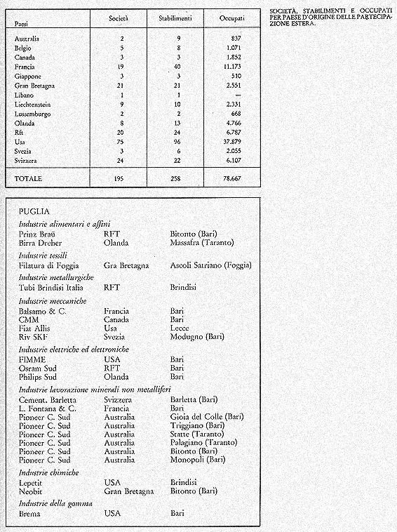 azionario non è risultato chiaramente di origine estera. Il discorso è interessante soprattutto nel momento in cui responsabili ed esperti del Ministero per gli interventi straordinari nel Mezzogiorno hanno preso contatti con alcuni Stati americani (California, Kentucky, New York) per consolidare una serie di investimenti, o per perfezionare nuovi investimenti nelle regioni meridionali, tenendo conto di due fattori rilevanti: - il Sud d'Italia può decollare solo se vi si impianteranno industrie produttrici di modernissima tecnologia; - il Sud dispone di circa 800 mila ettari di terreni irrigui - il doppio, ad esempio, rispetto ad Israele - e dunque può essere in grado di sviluppare un tipo di agricoltura specializzata d'avanguardia, con produzioni anticipate o ritardate, grazie a un clima che nessun altro Paese (tranne forse la Grecia la Spagna e il Portogallo) può permettersi. Ma Spagna, Grecia e Portogallo non dispongono, allo stato attuale, delle infrastrutture di cui dispongono le regioni meridionali della nostra Penisola. Se non si sfrutterà tempestivamente questo vantaggio, il recupero sarà poi difficile, se non impossibile. La rilevazione dello Iasm si limita alle unità locali manifatturiere con dieci addetti e oltre. Essa pertanto esclude, salvo casi eccezionali, le società a partecipazione estera i cui stabilimenti si collochino al di sotto di quella soglia dimensionale; le eccezioni si riferiscono a quelle società che, pur operando attraverso unità locali che occupano meno di dieci addetti, sono presenti in più di due stabilimenti, occupando complessivamente, dunque, più di dieci addetti. L'inclusione o l'esclusione di società dal novero di quelle elencate e effettuata unicamente in funzione dell'accertamento della presenza di partecipazioni estere; questo comporta, tra l'altro, l'inclusione di società le cui iniziative produttive nel Mezzogiorno risalgono per lo più ad epoca anteriore agli accordi intervenuti tra le due società, e che quindi non possono propriamente ricondursi ad una specifica scelta ubicazionale di società estere. Nella rilevazione si è ritenuto opportuno estrapolare il settore elettronico ed elettrico da quello meccanico, in modo da facilitare i rilevamenti e le valutazioni nei riguardi di un comparto che sta assumendo notevole importanza nel capo manifatturiero internazionale. Caratteristiche delle iniziative rilevate Nel complesso, al giugno 1981, sulla base della nuova rilevazione, si contavano nel Mezzogiorno 258 stabilimenti facenti capo a 195 società, con un'occupazione di circa 79 mila addetti. Per quanto riguarda i Paesi di origine della partecipazione, al primo posto figuravano gli Stati Uniti, con 96 stabilimenti e un'occupazione pari a circa 38 mila unità; seguivano nell'ordine la Francia (40 stabilimenti con oltre undicimila occupati) e la Repubblica Federale Tedesca, la Svizzera e la Gran Bretagna. Nel complesso, i Paesi della Comunità Economica Europea contribuivano alla presenza industriale nelle regioni meridionali con 108 stabilimenti e con oltre 27 mila occupati.