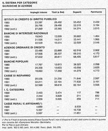 alternativi, i Bot in primo luogo. MODIFICHE Di STRUTTURA. Sottese alle fasi alterne della crescita dimensionale, si sono manifestate in questi anni importanti modifiche di struttura nell'attivo e nel passivo delle banche. Nei limiti di spazio di questa inchiesta, sarà sufficiente richiamare: il crescente ruolo di "intermediario nell'importazione di valuta" (con la crescita della raccolta all'estero sul totale della raccolta e degli impieghi in valuta sull'interno sul totale degli impieghi); il peso crescente, sul totale dell'attivo, delle attività detenute in virtù di vincoli diretti (riserva obbligatoria e vincolo di portafoglio) e indiretti, dato il massimale sugli impieghi (titoli, soprattutto di Stato); la destinazione di quote sempre maggiori, nell'ambito degli impieghi totali pur in relativa flessione, alle imprese private di medie e piccole dimensioni, con la correlativa diminuzione di quota delle imprese pubbliche e delle maggiori imprese private; l'aumento percentuale, malgrado la ricomposizione descritta, delle sofferenze sul totale degli impieghi. INNOVAZIONE FINANZIARIA. Come negli altri Paesi, anche se forse in misura inferiore ad alcuni di essi, si è sviluppato un significativo processo di innovazione finanziaria, nel duplice senso dei processi produttivi (impiego di tecnologie più avanzate) e dei prodotti (salita di quota, e diversificazione, dei servizi bancari rispetto alla tradizionale intermediazione o "gestione denaro"; sviluppo, anche da parte delle banche, dei cosiddetti servizi parabancari). Si può probabilmente affermare che il sistema dei vincoli amministrativi ha concorso a rendere meno veloce la innovazione dei processi, contenendo l'impulso concorrenziale; è più veloce invece l'innovazione dei prodotti, sommando ad una componente fisiologica di innovazione dei servizi una certa componente ulteriore di ricerca di forme e di circuiti nuovi di finanziamento come elusione dei vincoli gravanti sui circuiti più tradizionali. ALLOCAZIONE DELLE RISORSE. Nel complesso, come