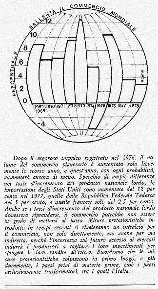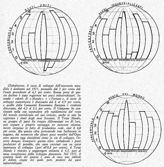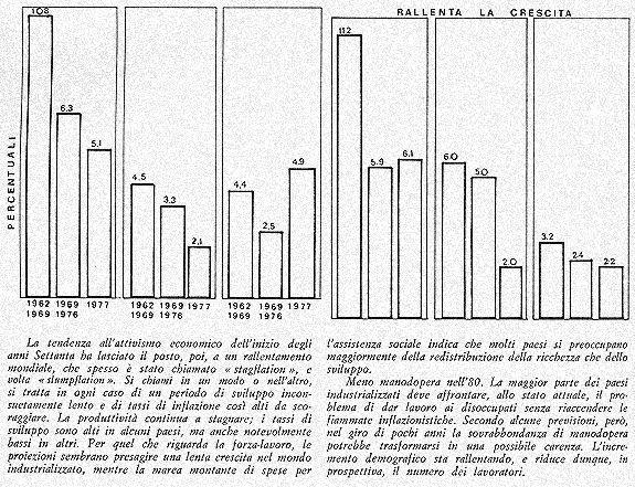 Se osserviamo attentamente quanto si è verificato negli ultimi anni, non facciamo fatica ad accorgerci che il ritmo di sviluppo del mondo industrializzato è stato tutt'altro che sostenuto. Dal '72 al '76 i paesi industrializzati si sono sviluppati a un ritmo annuo, in termini reali, del due per cento: un tasso - nota " Il Mondo " - inferiore di circa tre punti percentuali al ritmo raggiunto mediamente nei dodici anni precedenti. " Se questa decelerazione dovesse protrarsi, l'indice di crescita del Quarto Mondo dovrebbe scendere tra il 2,7 per cento e il 3,2 per cento. E dato che la popolazione di buona parte dei paesi più poveri aumenta a un ritmo superiore al tre per cento l'anno, il reddito pro-capite diminuirebbe oltre gli attuali, già bassi livelli. Occorrono quindi forti tassi di progresso economico nei paesi industrializzati non solo per ridurre la disoccupazione in questi stessi paesi, ma anche per evitare il deterioramento dei tenori di vita di una grande porzione degli abitanti più poveri del pianeta ".
