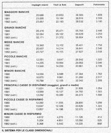 alternativi, i Bot in primo luogo. MODIFICHE Di STRUTTURA. Sottese alle fasi alterne della crescita dimensionale, si sono manifestate in questi anni importanti modifiche di struttura nell'attivo e nel passivo delle banche. Nei limiti di spazio di questa inchiesta, sarà sufficiente richiamare: il crescente ruolo di "intermediario nell'importazione di valuta" (con la crescita della raccolta all'estero sul totale della raccolta e degli impieghi in valuta sull'interno sul totale degli impieghi); il peso crescente, sul totale dell'attivo, delle attività detenute in virtù di vincoli diretti (riserva obbligatoria e vincolo di portafoglio) e indiretti, dato il massimale sugli impieghi (titoli, soprattutto di Stato); la destinazione di quote sempre maggiori, nell'ambito degli impieghi totali pur in relativa flessione, alle imprese private di medie e piccole dimensioni, con la correlativa diminuzione di quota delle imprese pubbliche e delle maggiori imprese private; l'aumento percentuale, malgrado la ricomposizione descritta, delle sofferenze sul totale degli impieghi. INNOVAZIONE FINANZIARIA. Come negli altri Paesi, anche se forse in misura inferiore ad alcuni di essi, si è sviluppato un significativo processo di innovazione finanziaria, nel duplice senso dei processi produttivi (impiego di tecnologie più avanzate) e dei prodotti (salita di quota, e diversificazione, dei servizi bancari rispetto alla tradizionale intermediazione o "gestione denaro"; sviluppo, anche da parte delle banche, dei cosiddetti servizi parabancari). Si può probabilmente affermare che il sistema dei vincoli amministrativi ha concorso a rendere meno veloce la innovazione dei processi, contenendo l'impulso concorrenziale; è più veloce invece l'innovazione dei prodotti, sommando ad una componente fisiologica di innovazione dei servizi una certa componente ulteriore di ricerca di forme e di circuiti nuovi di finanziamento come elusione dei vincoli gravanti sui circuiti più tradizionali. ALLOCAZIONE DELLE RISORSE. Nel complesso, come